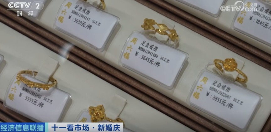 广东深圳某黄金珠宝品牌门店店长张妮蔓:国庆期间,新品搭配好的婚庆4件套(一口价产品),相对来说比较受结婚的人喜爱,价格是一万多元,性价比较高。