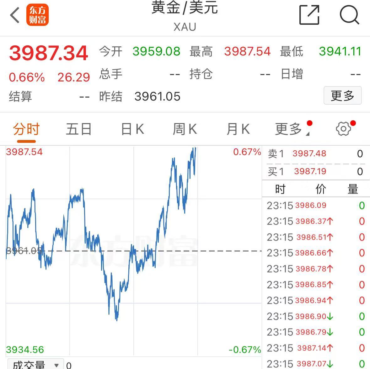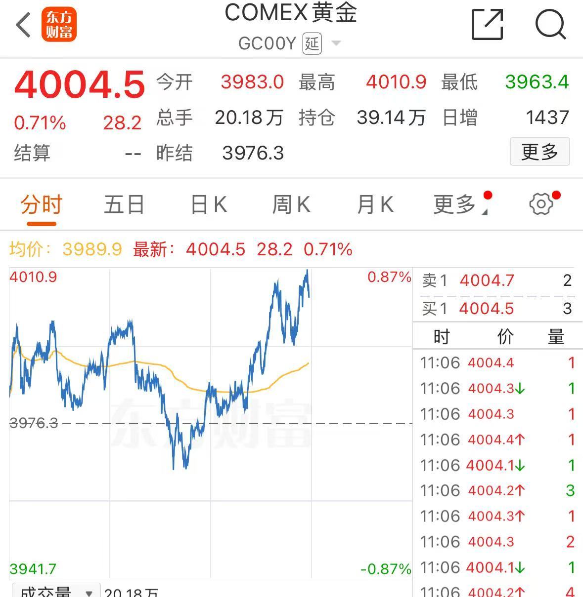 现货黄金市场表现强劲,一度突破3980美元/盎司,截至发稿报3987美元/盎司,创历史新高。同时,COMEX黄金期货也表现不俗,升破4000美元/盎司,盘中最高触及4010.9美元,显示出黄金市场的强劲势头。