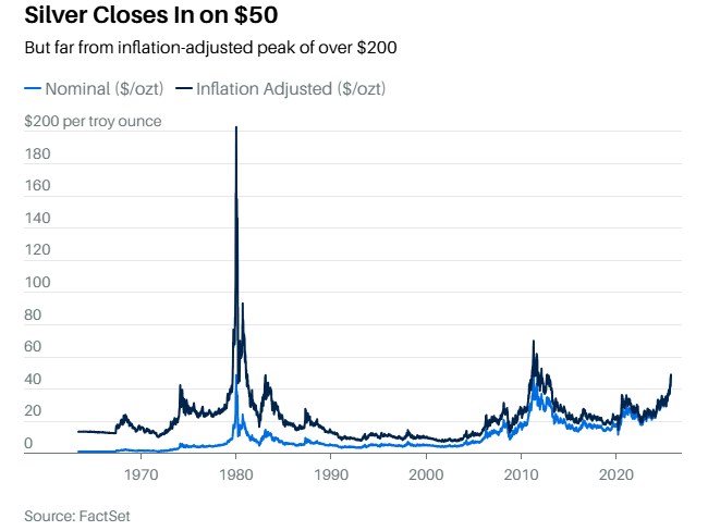 在历史上,现货白银价格此前还从未突破过每盎司50美元大关(历史高点为49.79美元)……