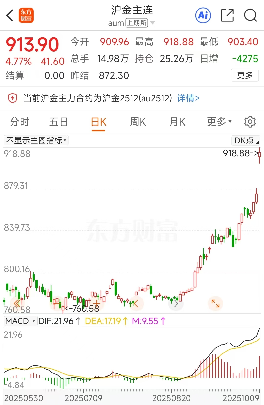受国庆假期期间金价飙涨带动,10月9日早盘A股贵金属板块强势领涨,黄金市场表现亮眼,早盘收盘时指数大涨7.3%,板块中四川黄金、山东黄金涨停。沪金期货(黄金期货)主力合约在10月9日也是跳空大涨,突破900元/克关口,创历史新高,早盘收盘时报913.9元/克。