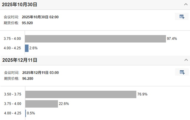 而美联储利率观测工具最新数据显示,10月美联储降息25个基点的概率高达97.4%,12月继续降息25个基点的概率为76.9%。目前,美国的联邦基金利率目标区间为4%~4.25%。