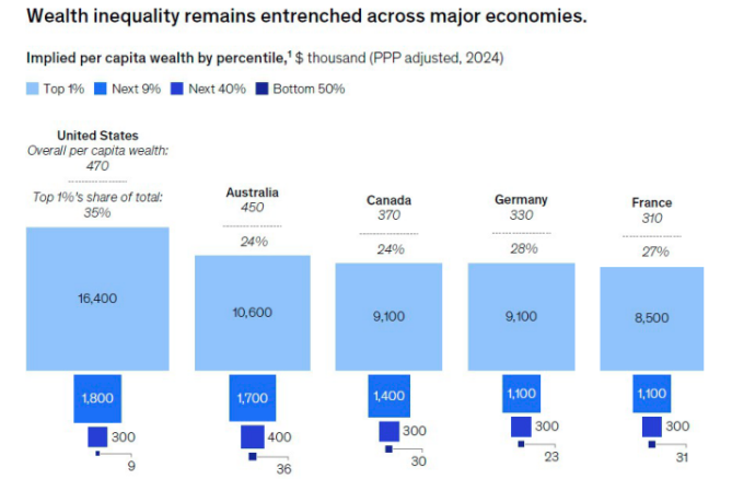 自2000年以来,全球净资产总量已增长近四倍,至去年年底达到600万亿美元,考虑到过去九个月的市场走势,这一数字无疑还在继续攀升。但这一数字与实际经济表现的脱节日益加剧——从25年前的全球GDP的4.7倍扩大至了如今的5.4倍。财富集中度也仍令人震惊:前1%的富翁群体拥有全球五分之一的财富。