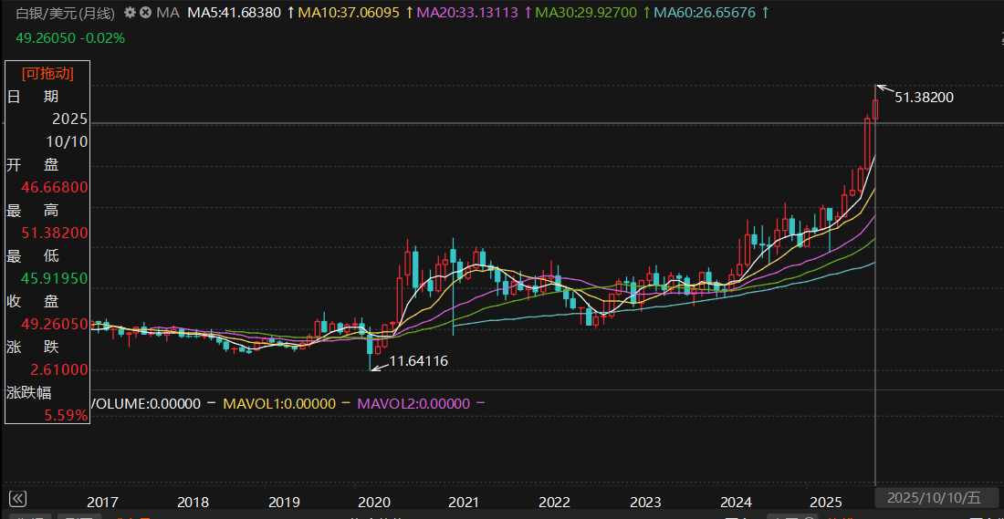 10月9日,现货白银价格突破50美元/盎司,为历史首次。10月10日,据东方财富Choice数据,白银开盘价报46.67美元/盎司,最高达51.38美元/盎司,年内涨幅超70%。