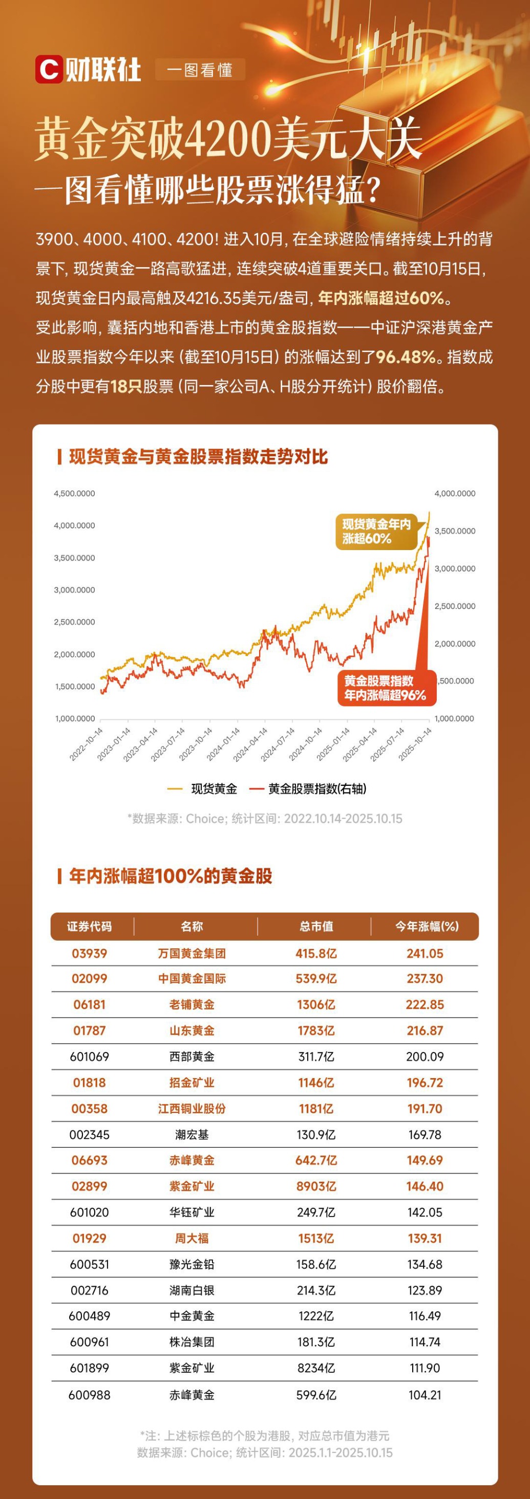 10月15日现货黄金突破4200美元,黄金股指数年内大涨