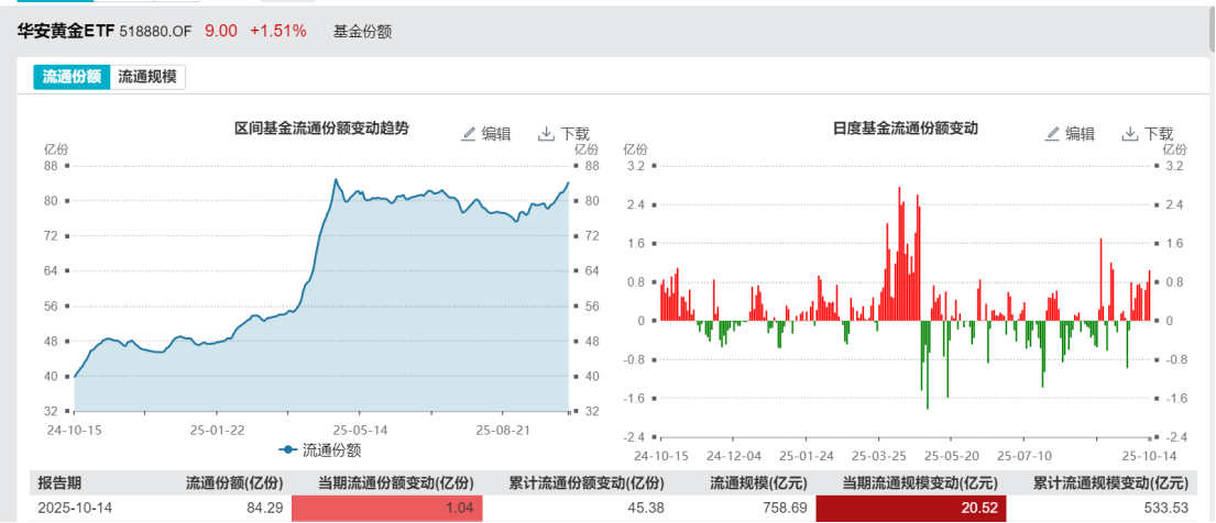 10月15日,现货黄金史上首次突破4200美元/盎司关口。现货白银同样涨幅走阔。非货ETF市场上,黄金ETF本月以来涨幅领跑,仅过去6个交易日,累计涨幅已经超过10%,今年累计涨幅多超过50%。申购基金份额的步伐也并未停下,规模自然也持续新高。截至10月14日,跟踪SGE黄金9999的7只ETF合计规模已经来到1767.68亿元,较去年底的673.55亿元增长了162.44%,百亿级基金增至4只。其中,规模最大的华安黄金ETF,从去年底的286.76亿元,到目前的758.69亿元的历史峰值,增加了471.93亿元,增长164.58%。