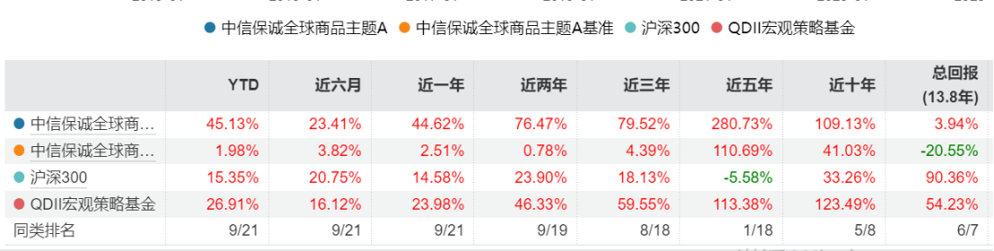除了被动指数基金,重仓黄金赛道也成为不少主动权益基金、FOF基金斩获可观净值收益的关键所在。比如,中信保诚全球商品主题LOF近5年净值回报为280.73%,领先市场,年内净值也上涨了45.13%。从持仓来看,该基金在二季度全面加大了黄金主题ETF的仓位,至二季度末,重仓基金均为黄金ETF,此前的原油主题ETF退出重仓行列。