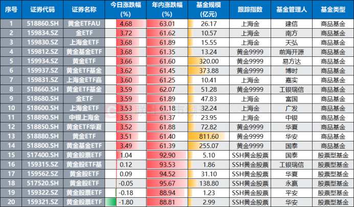 注:目前20只黄金相关的股票型、商品型ETF今日表现情况(基金规模截至10月16日,其余数据截至10月17日)
