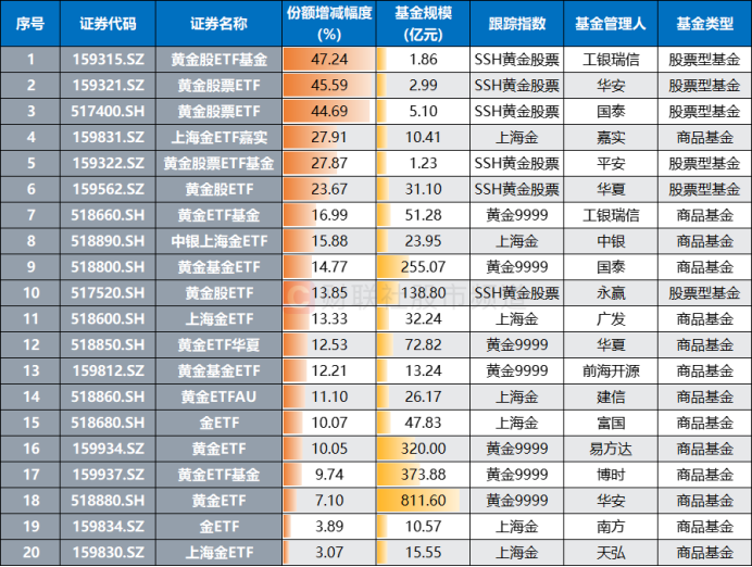 注:目前20只黄金相关的股票型、商品型ETF月内份额变动情况(基金规模、份额截至10月16日,其余数据截至10月17日)