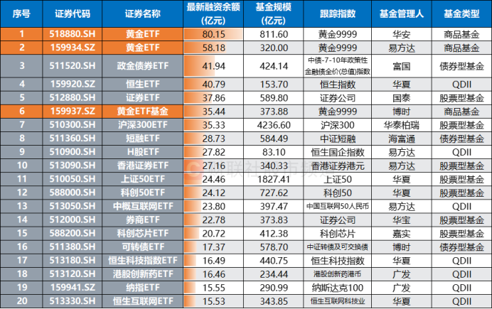 注:目前20只黄金相关的股票型、商品型ETF月内/年内融资余额变动情况(截至10月16日数据)