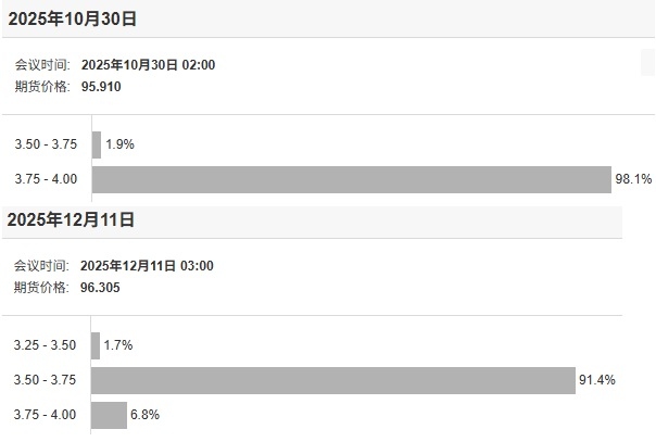 除了避险情绪对金价的影响外,“美联储降息”也是金价讨论中的关键词。美联储利率观测工具的最新数据显示,美联储10月降息25个基点的概率高达98.1%,降息50个基点的概率为1.9%。也就是说,不降息的概率为0。