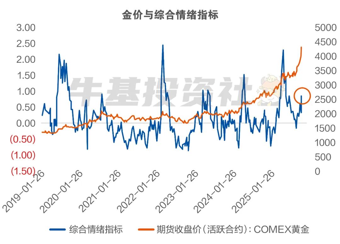 从技术面看,金价或已进入高位震荡阶段。短期情绪指标显示市场情绪偏热,甚至触发“过热”阈值,预示着波动可能进一步放大。
