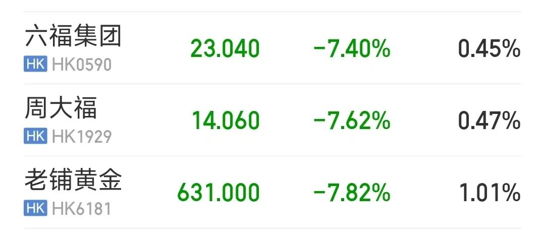 11月3日,港股黄金零售品牌商集体下挫,黄金市场波动引发关注。截至发稿,老铺黄金、周大福、六福集团大跌超7%,周生生跌超6%,A股贵金属板块亦领跌,湖南黄金跌超4%,晓程科技、山金国际跌超2%,中金黄金跌1.94%。