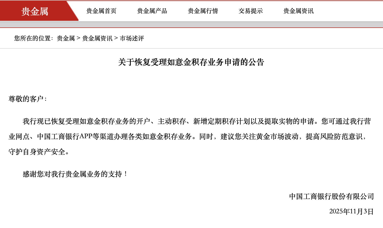 此前,工商银行同日发布公告称,受宏观政策影响,根据本行风险管理要求,自2025年11月3日起,暂停受理如意金积存业务的开户、主动积存、新增定期积存计划以及提取实物的申请,存量客户处于有效期内的定期积存计划的执行以及办理赎回、销户不受影响。相关业务恢复事宜,请关注后续公告。