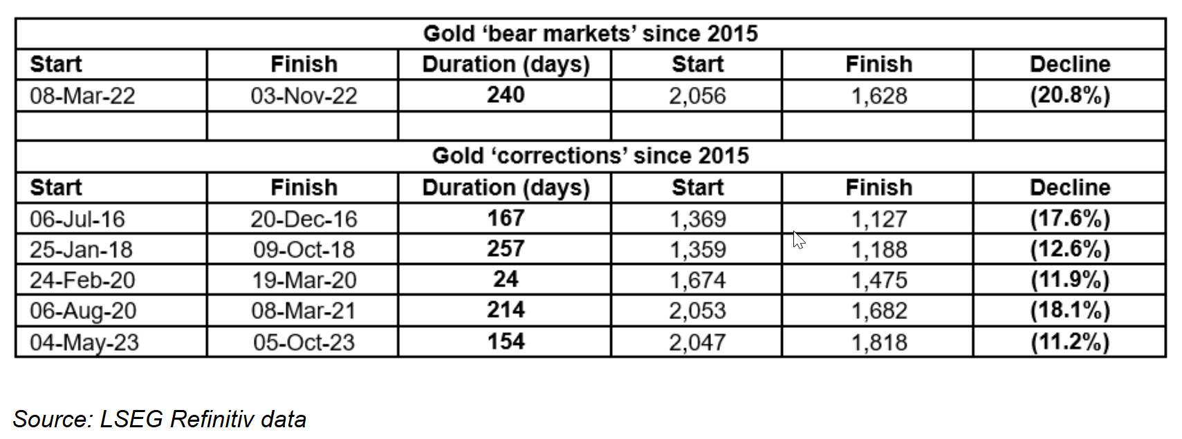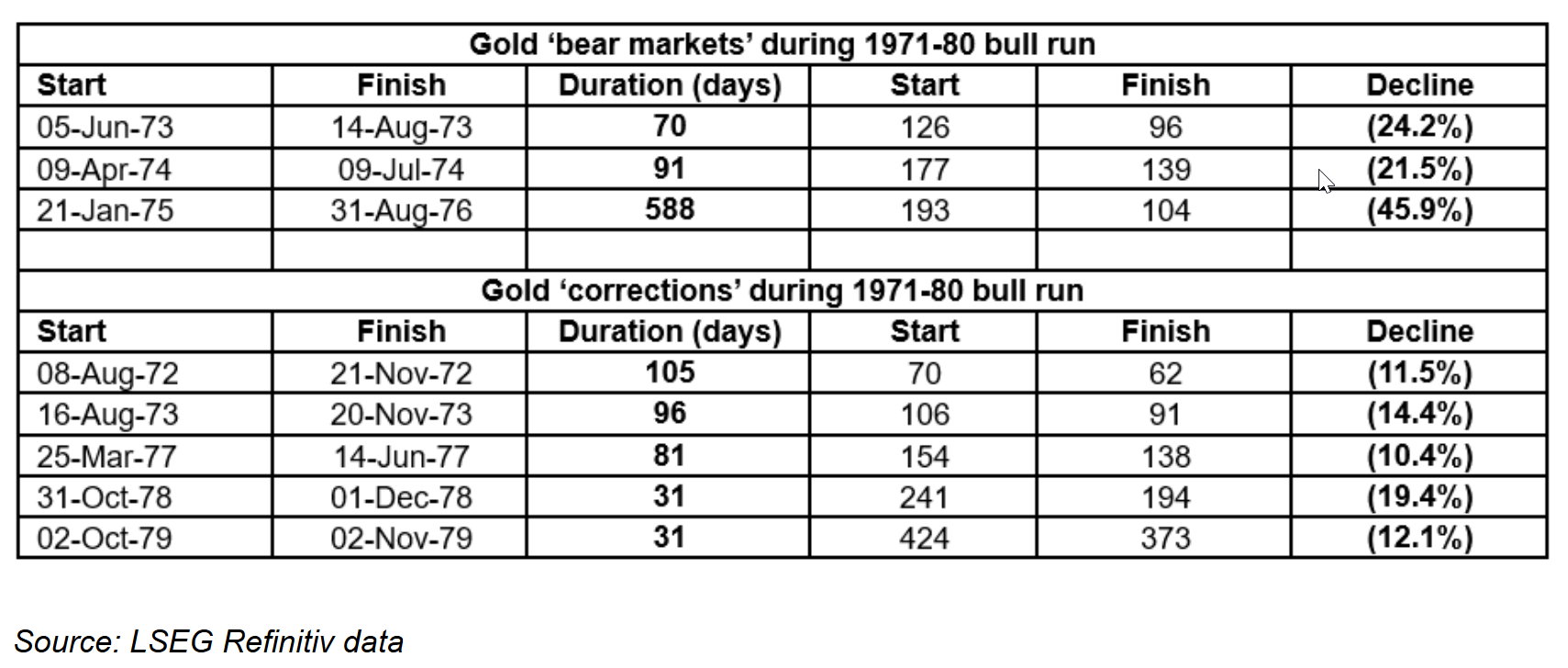 他指出,即使是上世纪70年代的黄金牛市,也出现了不少于三次的“迷你熊市”,其中金价分别在1973年和1974年下跌了20%以上,还有一次从1975年1月到1976年夏季持续了18个多月。“除此之外,黄金还经历了五次价格回调,跌幅在10%到20%之间,分别发生在1972年、1973年、1977年、1978年和1979年。”他写道。Mould说,虽然最后两次下跌只持续了一个月,但“它们仍然挑战了黄金投资者的决心,尽管金价在牛市的最后冲刺阶段几乎是垂直上涨的。”
