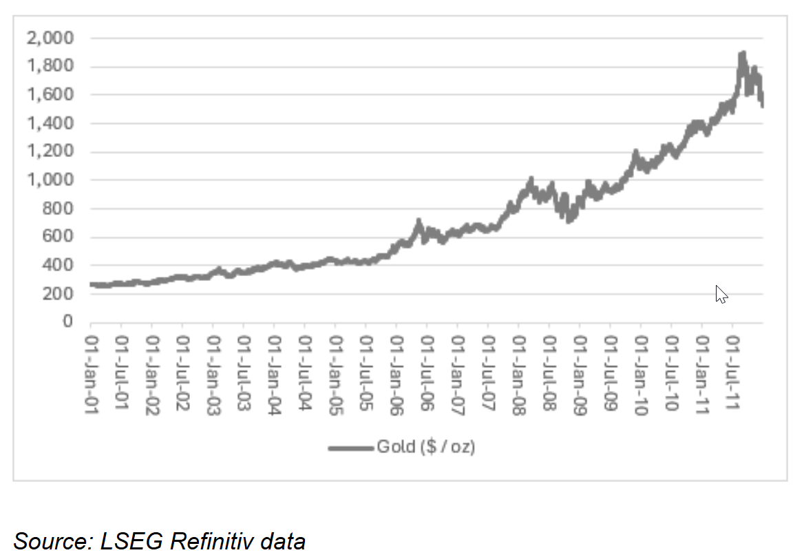 “但即使是在这第二次飙升期间,黄金也曾在2006年和2008年两次出现熊市,尽其所能考验信徒的决心,同时还有五次超过10%的修正,分别在2003年、2004年、2006年、2009年和2010年。”他补充道。