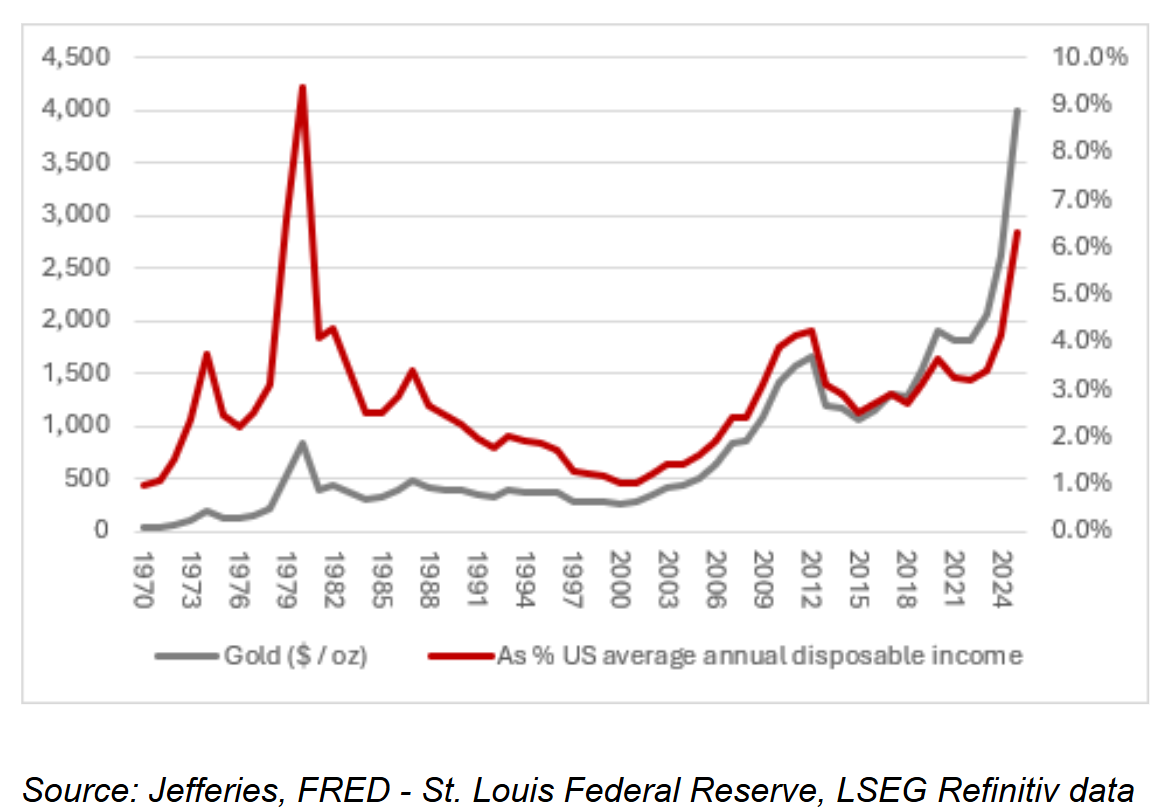 最后,Mould谈及了投资者们最关心的问题——如何判断金价是否接近本轮周期的峰值,他指出,“一个可能的指标是金价的可承受程度”。他写道,“判断这一点的一种方法是,看看一个家庭在收入达到上限的情况下可以购买多少黄金。如果黄金超出了普通工人的承受能力,或者大胆地说,超出了私人投资者的承受能力,那至少会削弱一个增量购买的来源。”