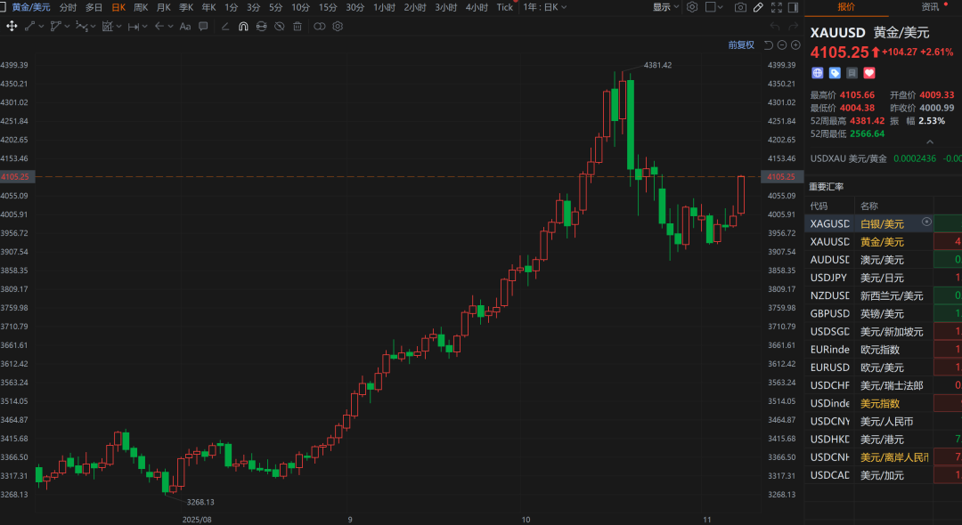 昨日,现货黄金价格持续走高,美股盘前向上突破4100美元/盎司,为10月27日以来首次,日内涨超2.6%。纽约期金价格同样突破4100美元/盎司,涨2.32%。现货白银价格涨逾3.6%,纽约期银价格大涨4%,黄金市场迎来一波强劲涨势。