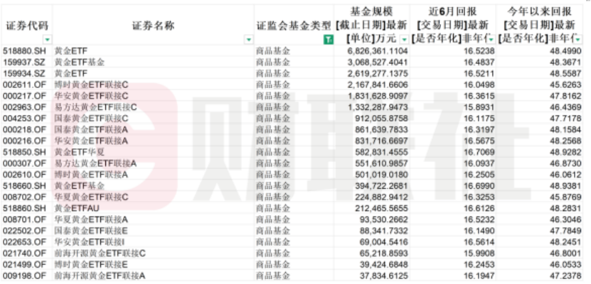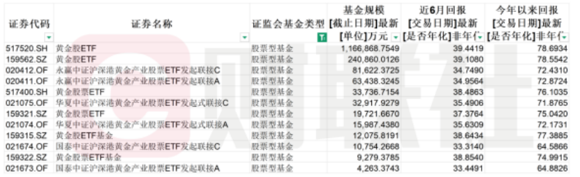 与此同时,股票型黄金ETF因收益弹性更高而受到市场关注。Choice数据显示,全市场股票型黄金ETF共12只,规模达169.15亿元,近6个月回报率普遍介于33%-40%之间,显著高于商品型黄金ETF。该类基金主要投资于黄金产业链上市公司,覆盖金矿开采与零售等环节。