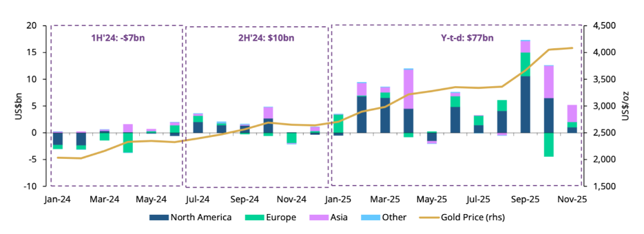 根据世界黄金协会(WGC)的数据,全球黄金ETF在11月底的总持仓量升至3932吨,连续第六个月增长。其中,2025年新增买入就超过700吨,使得今年有望成为黄金ETF史上持仓增幅最大的一年。
