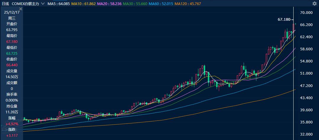 受避险需求和技术性买盘拉动,黄金价格当日小幅上涨,白银价格则大幅攀升再创新高,盘中交易一度达到每盎司67.18美元。