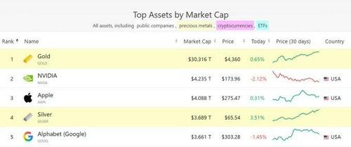从市值来看,随着周三逾4%的新一轮大涨行情展开,白银的市值目前已超越了近来风头正盛的AI“当红炸子鸡”谷歌,跻身成为了全球第四大资产——目前市值规模仅低于黄金、英伟达和苹果。