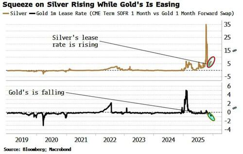 最新租赁价格显示,近来实物黄金市场的供应紧张局面可能正在缓解,但白银供应似乎依然趋紧。白银租赁利率在10月初曾大幅上涨,随后回落,但现在又开始快速上涨。这表明实物白银的短缺比黄金更为严重,而这可能也正是白银近期大幅跑赢黄金的原因。
