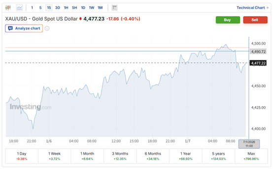 就在达里奥发出上述警告之际,2026年新年伊始,金价上涨动力仍然强劲。周三亚洲盘,现货金一度重新站上4500美元/盎司上方,不过截至发稿,金价已转跌。