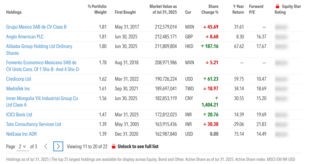 此外,富达旗下的Fidelity Emerging Markets Fund最新规模为83亿美元。按照晨星的刻画,该基金倾向于投资大盘成长股。7月,该基金加仓PT BANK Central ASIA Tbk 11.44%,加仓拼多多2.52%,加仓宁德时代23.41%,加仓三星生物制剂80.63%;减持腾讯音乐6%。