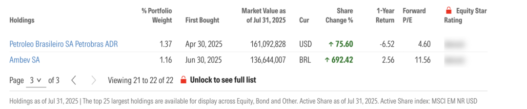 7月,该基金加仓Ambev SA 692.42%,加仓Petroleo Brasileiro SA Petrobras 75.60%。