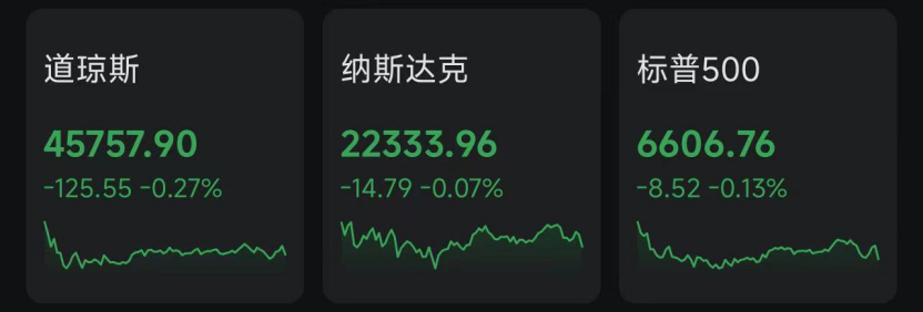 当地时间周二,美股三大指数集体收跌。截至收盘,道指跌125.55点,跌幅0.27%,报45757.90点;纳指跌14.79点,跌幅0.07%,报22333.96点;标普500指数跌8.52点,跌幅0.13%,报6606.76点。