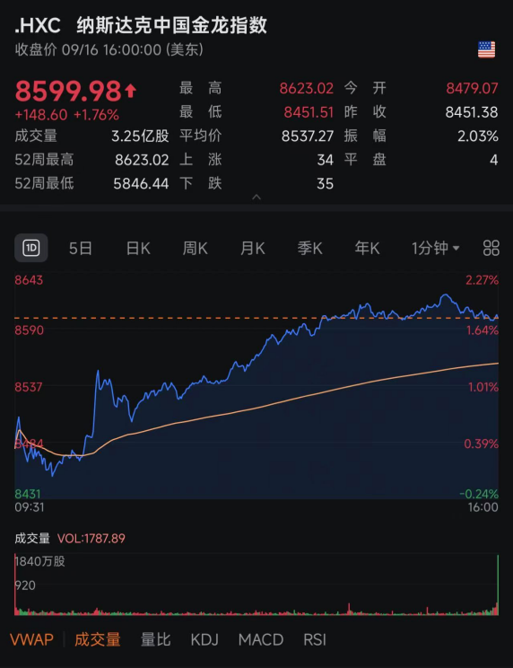 当地时间9月16日,美股市场遇冷,三大指数集体收跌。截至收盘,道指跌0.27%,报45757.90点;纳指跌0.07%,报22333.96点;标普500指数跌0.13%,报6606.76点。中国资产表现亮眼,纳斯达克中国金龙指数逆势收涨1.76%,创2022年2月以来新高。热门中概股多数上涨,蔚来涨超8%,百度涨超7%,京东、爱奇艺涨超3%,阿里巴巴涨超2%。(美股动态,中国资产表现)