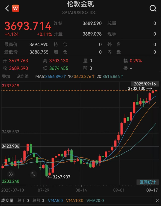 隔夜,黄金期现货联袂创新高。其中,伦敦现货黄金盘中最高涨至3700美元/盎司上方;COMEX黄金期价在突破3700美元/盎司后继续走强,盘中最高逼近3740美元/盎司历史高位。