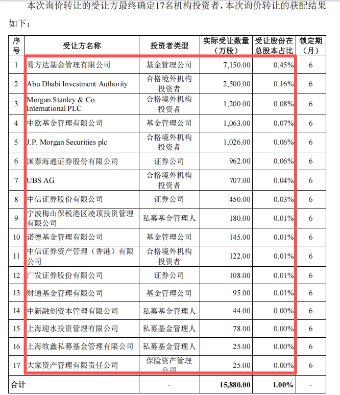 9月30日,东方财富收盘价为27.12元,上述拟转让的2.38亿股股份市值达64.55亿元。记者注意到,本次进行询价转让的东方财富股东沈友根于今年已进行过一次询价转让,吸引了包括阿布达比投资局、摩根士丹利、摩根大通、瑞银等27家境内外机构投资者参与。