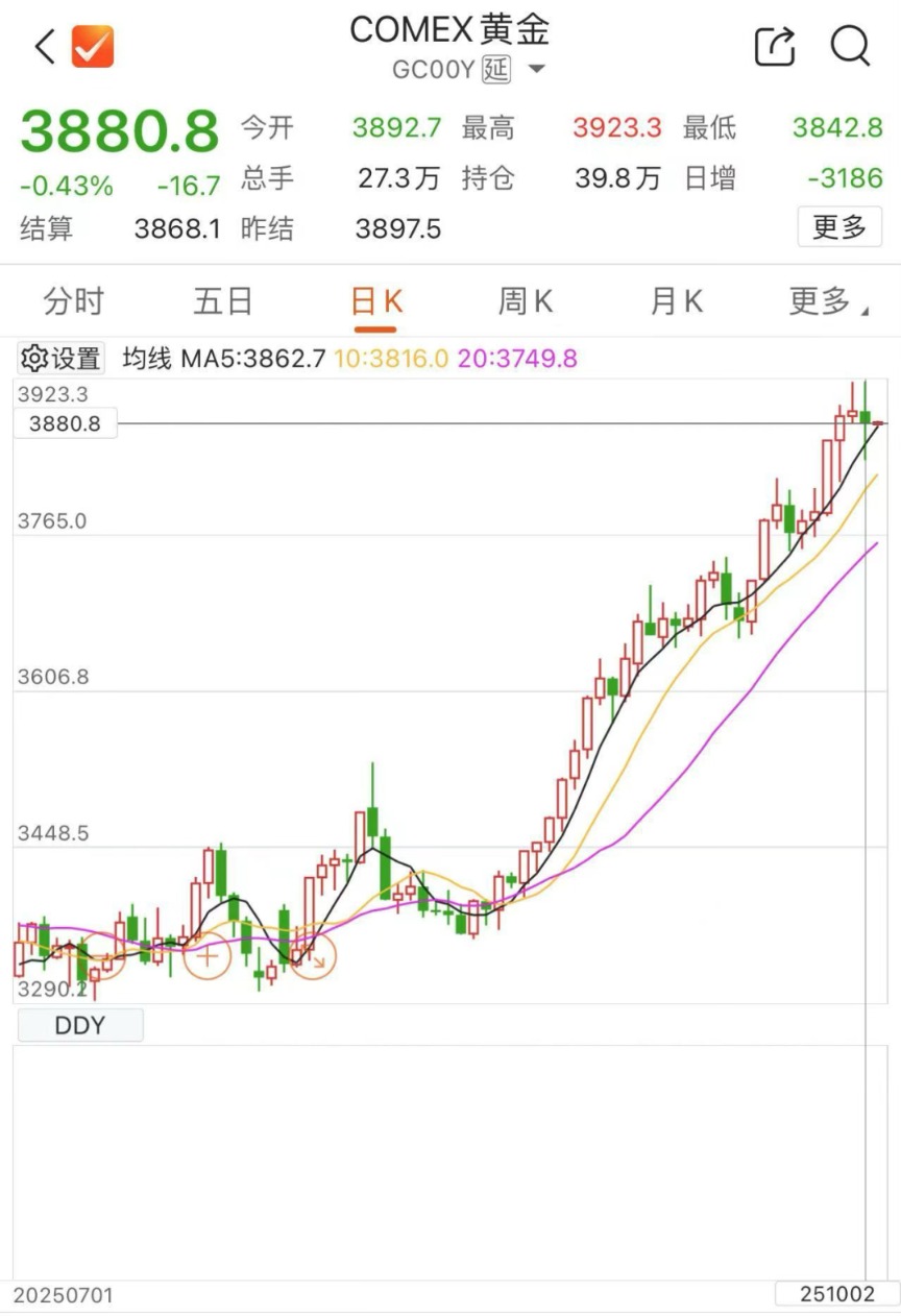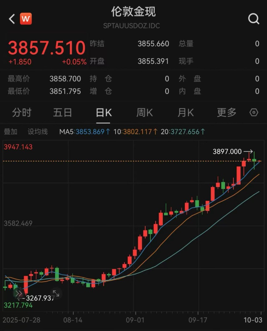10月3日早盘,国际金价继续小幅上涨。其中,伦敦现货黄金在3850美元/盎司附近徘徊,COMEX黄金期价维持在3880美元/盎司上方。隔夜,尽管小幅收跌,但国际金价仍创下盘中新高。伦敦现货黄金最高逼近3900美元/盎司;COMEX黄金期价则升破3923美元/盎司。