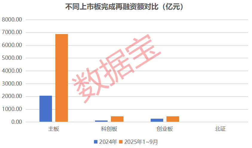 从已实施的再融资来看,今年前三季度,主板再融资总额大幅超越上一年全年,接近6878亿元,主要由中国银行、邮储银行、交通银行及建设银行4大国有行定增募资5200亿元贡献。双创板块再融资总额均超过上一年全年的水平。其中,科创板再融资额接近456亿元,较上一年全年增加超260%;创业板再融资额接近447亿元,较上一年全年增加近65%。