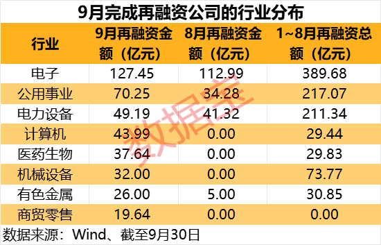 9月份,多家知名企业完成定增股份发行,A股再融资市场呈现活跃态势。