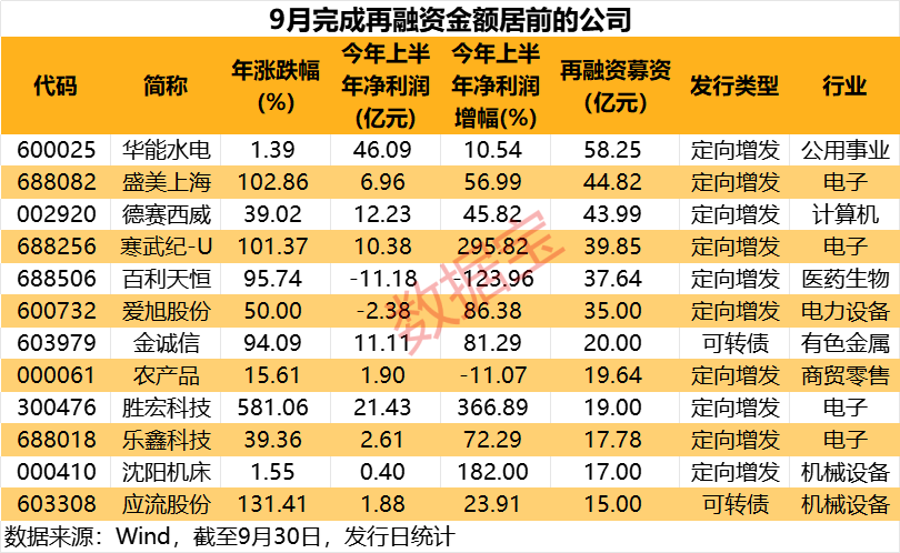 从单家公司来看,9月份完成再融资募资公司中,有12家公司完成募资超过15亿元,其中6家超过35亿元,依次有华能水电、盛美上海、德赛西威、寒武纪-U等。华能水电完成定增募资58.25亿元,发行对象有国家绿色发展基金、中央企业乡村产业投资基金等,募集资金主要用于RM水电站项目、TB水电站项目。盛美上海完成定增募资44.82亿元,主要用于高端半导体设备迭代研发项目、补充流动资金;发行对象包括多家基金公司、保险公司等。寒武纪-U完成定增募资39.85亿元,发行价为1195.02元/股,发行对象有公募基金、外资机构、证券公司等,募集资金主要用于面向大模型的芯片平台项目、面向大模型的软件平台项目及补充流动资金。截至9月30日,这12家公司年内平均涨幅超过100%,胜宏科技、应流股份、盛美上海涨幅位居前3位;今年上半年净利润增幅居前三的公司分别为胜宏科技、寒武纪-U及沈阳机床。
