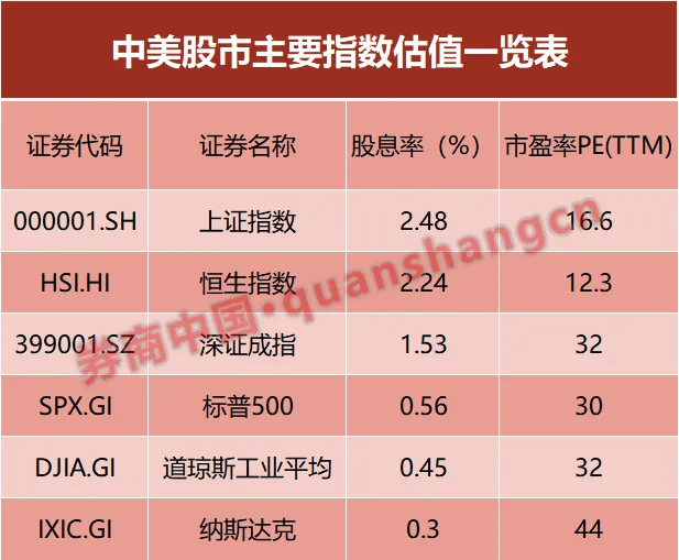 俗话说,不怕不识货,就怕货比货。按照欧文·费雪的现金流贴现理论,中国资产估值优势明显,站在当前看,中国资产的现金流、估值与全球其他主要市场相比,吸引力如何呢?截至9月30日,上证指数的股息率为2.48%,对应的市盈率为16.6倍;恒生指数的股息率为2.24%,对应的市盈率为12.3倍。而道琼斯工业平均指数的股息率仅为0.56%,对应的市盈率为32倍;纳斯达克指数的股息率0.3%,对应的市盈率为44倍。巴菲特手持3000多亿美元的现金,某种程度上是美股市场整体高估的标志。