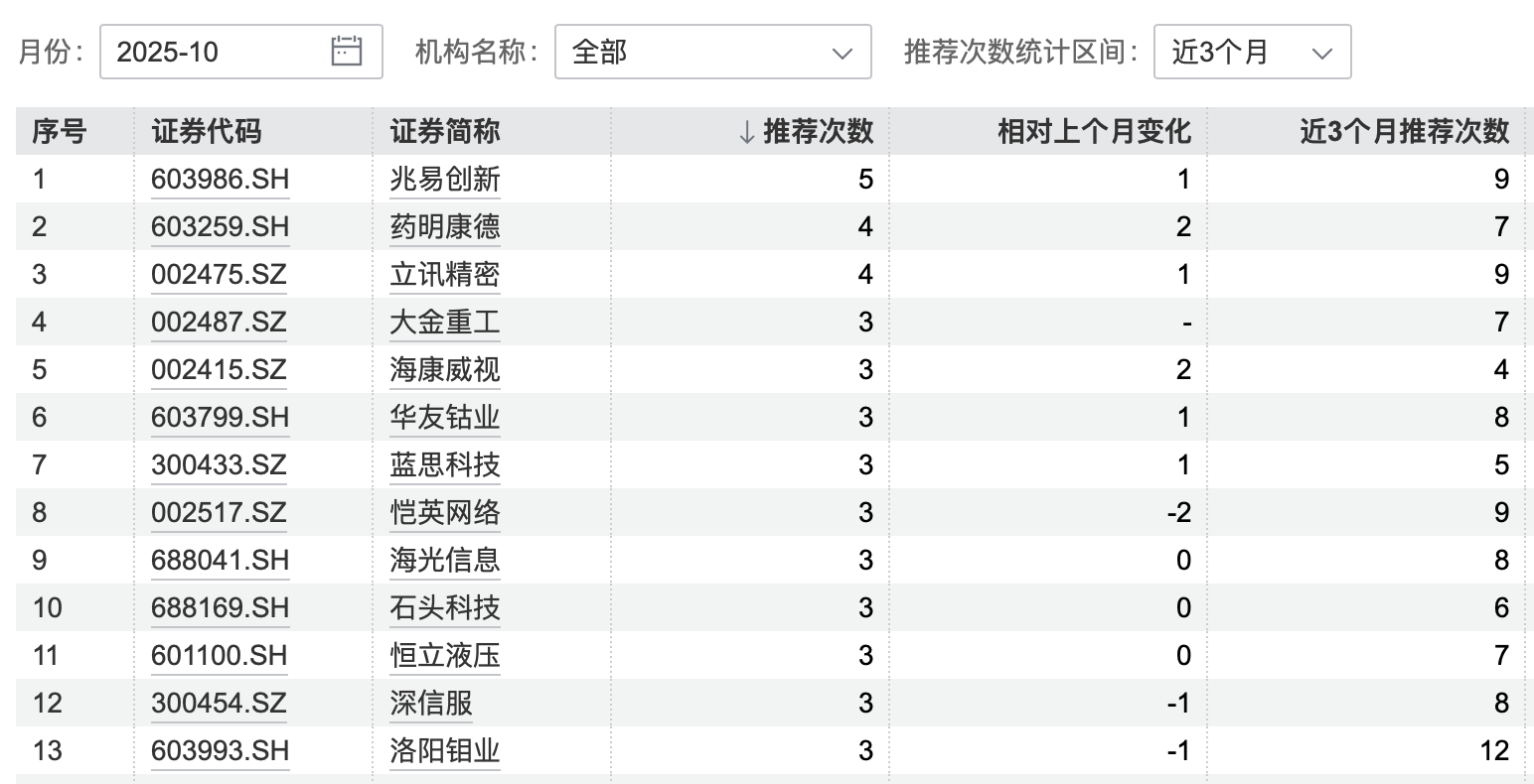 数据显示,截至10月5日发稿,已有26家券商发布了10月金股推荐,共计推荐196只股票。在10月金股推荐榜中,兆易创新被推荐次数最多,被中泰证券、东海证券、中原证券、中航证券以及华金证券5家券商同时推荐。兆易创新近3个月被累计推荐9次,9月涨幅达34.17%。立讯精密、药明康德被推荐次数并列第二,均被4家券商同时推荐,9月涨幅分别为40.69%、10.38%。与此同时,还有10只股票同时被3家券商推荐,其中有半数属于信息技术行业,如海康威视、蓝思科技、海光信息、恺英网络、深信服。另外5只分别为大金重工、华友钴业、石头科技、恒立液压、洛阳钼业。