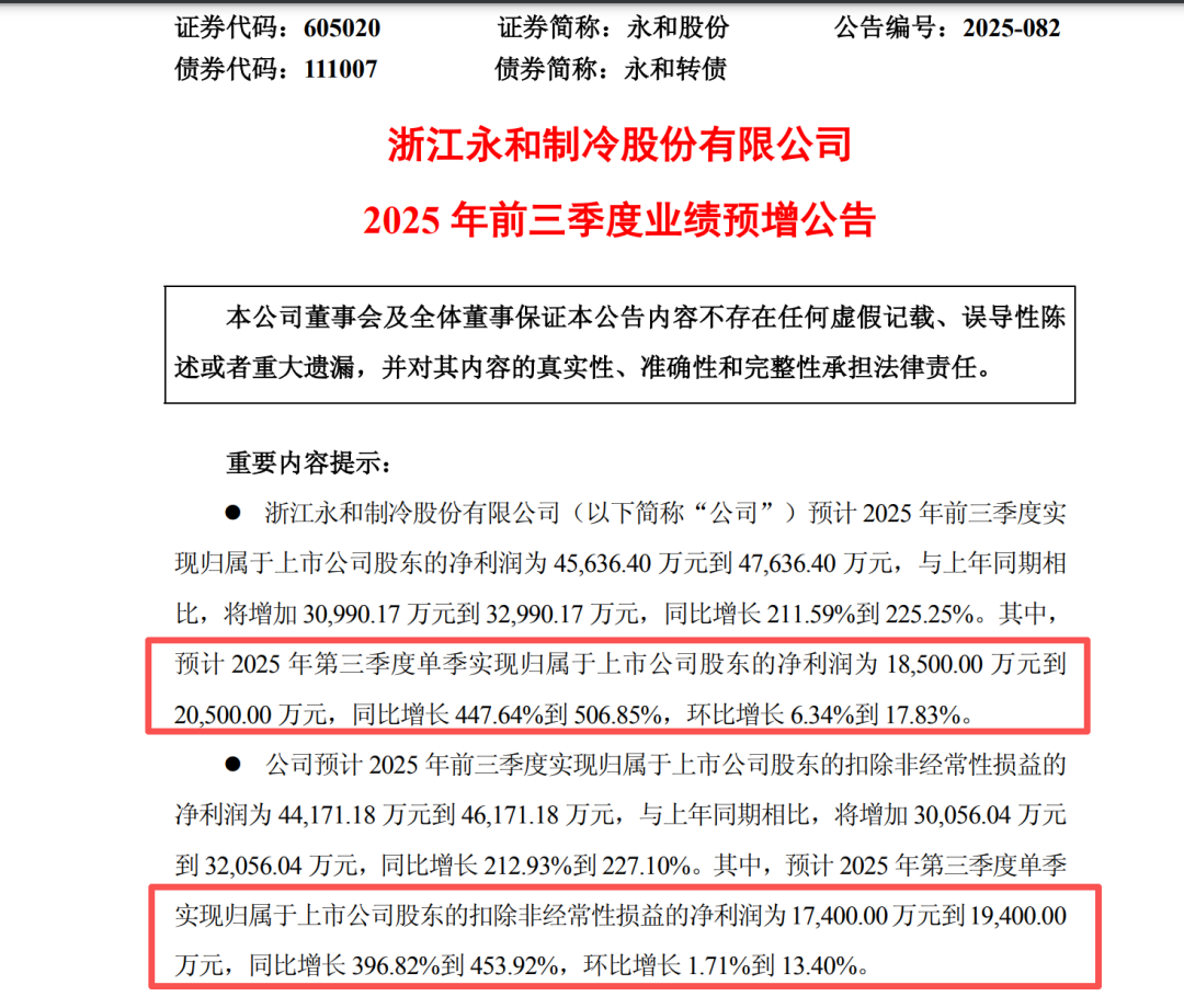 受益于制冷剂行业持续的高景气度,永和股份(证券代码:605020)预计前三季度业绩大幅增长,氟化工行业迎来发展机遇。10月8日晚间,永和股份发布2025年前三季度业绩预增公告。公司预计前三季度实现归母净利润4.56亿元至4.76亿元,同比增长211.59%至225.25%,业绩表现亮眼。