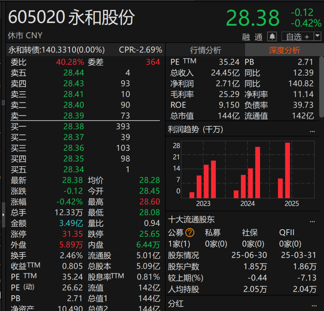 截至9月30日,永和股份报28.38元/股,总市值为144亿元。