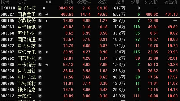 今天早盘,包括核聚变、超导、量子科技等相关题材涨幅居前。另外,9月16日,英国和美国就《科技繁荣协议》达成一致。长江证券表示,此次英美就《科技繁荣协议》达成一致,有望推动量子科技在这一国家级的行动计划下加速发展,从而带动包括基础光电元器件、量子通信核心元器件、量子通信传输干线、量子系统平台,以及应用层的量子科技全产业链发展。长江证券建议关注量子科技全产业链,重点关注量子计算及量子通信龙头企业。