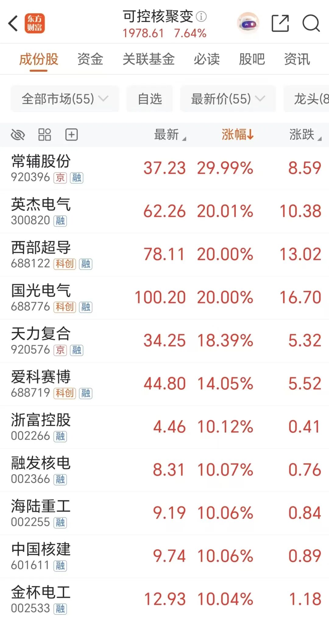 核聚变工程领域重大进展引爆板块涨停潮!可控核聚变作为能源革命核心方向,周四(10月9日)概念板块大涨近8%,核聚变技术突破与商业前景引发资本热捧。个股方面,英杰电气、国光电气、西部超导等多股20CM涨停,爱科赛博涨超14%,中国核建、旭光电子、安泰科技、合锻智能、永鼎股份、上海电气、厦门钨业等多股涨停。