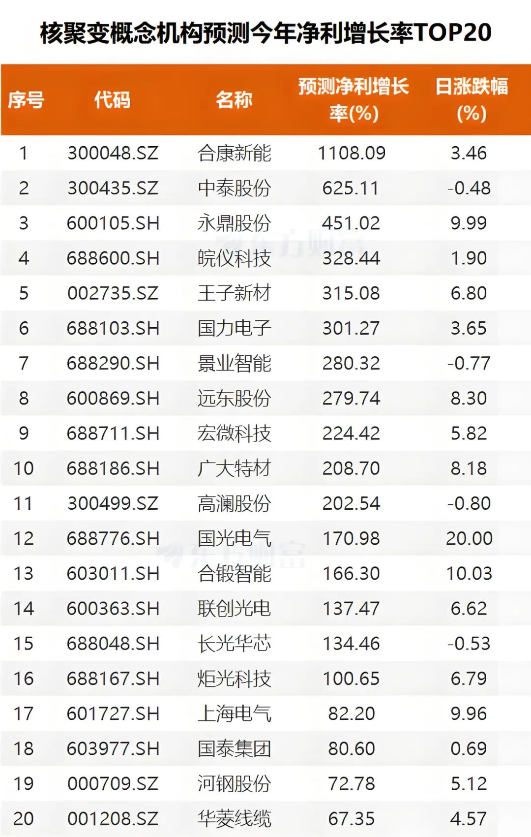 中国银河证券8月11日研报显示,永鼎股份的高温超导带材产能在2025年上半年达到约2000公里,并计划在2-3年内进一步扩充至2万公里,以满足核聚变行业对高温超导材料日益增长的需求。又比如周四录得20CM涨停的国光电气,机构预测今年净利润增长率超170%。中航证券表示,国光电气是包层模块第一壁板核心生产企业,随着未来托卡马克装置步入氘氚燃料聚变反应阶段,后续包层模块将升级为氚增殖包层以解决“氚自持”问题,这也是聚变堆能否实现商业化的核心。开源证券表示,全球可控核聚变竞赛已拉开帷幕,各国可控核聚变公司融资活动频繁,美国科技巨头踊跃入局投资。参考当前国内裂变堆每年10GW级的核准建设节奏,若核聚变发电站顺利实现商业化,未来批量建设情景下一年投资额或将达数千亿元。
