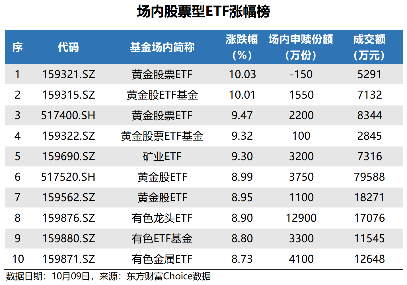 场内股票型ETF动态:黄金ETF领涨,证券ETF获净申购最多