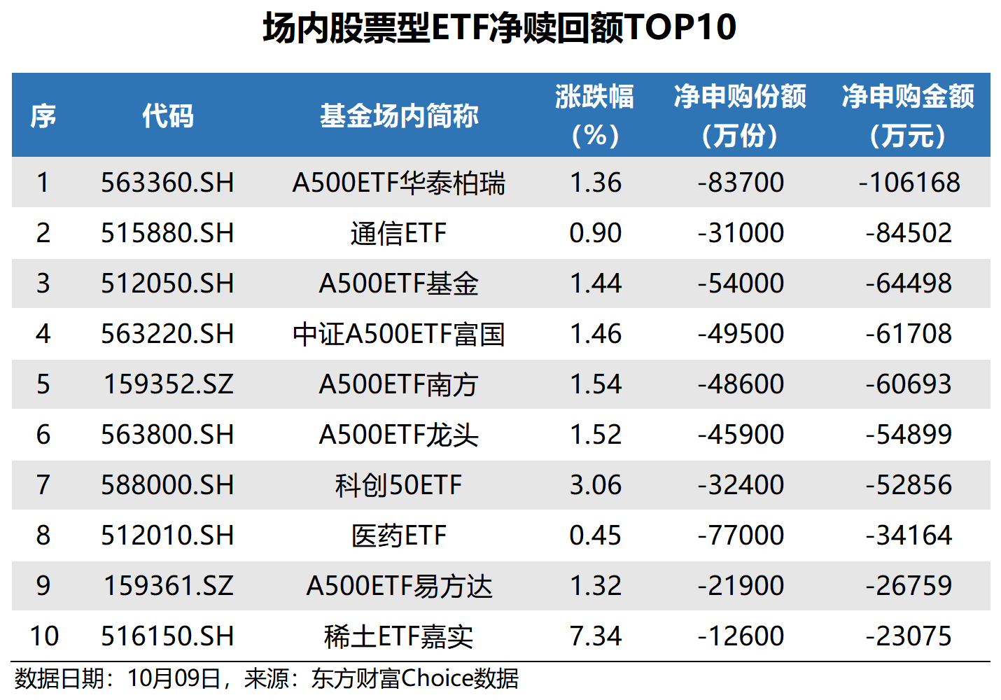 数据还显示,昨日净赎回金额最多的场内股票型ETF为A500ETF华泰柏瑞,净赎回金额10.62亿元;通信ETF紧随其后,净赎回金额8.45亿元,市场资金流向呈现分化态势,投资者需关注市场动态。