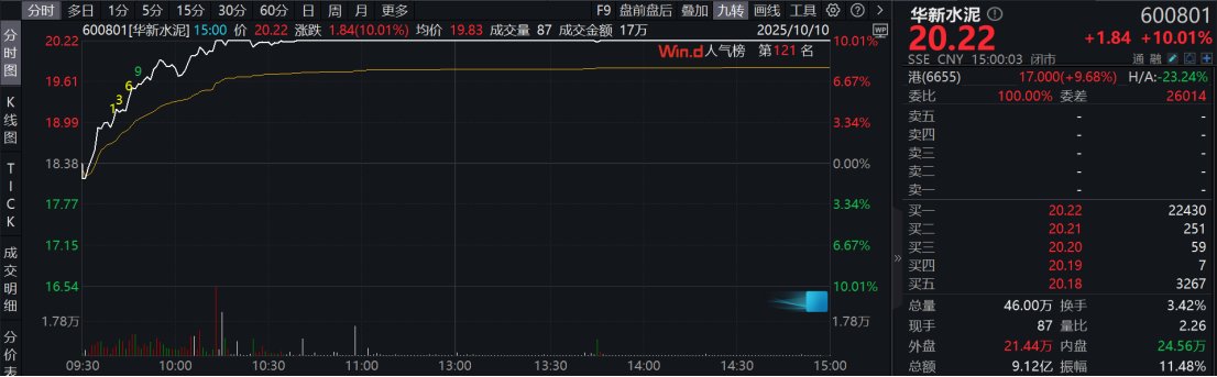 A股在10月10日整体回调,华新水泥却是逆势涨停,截至收盘报20.22元。