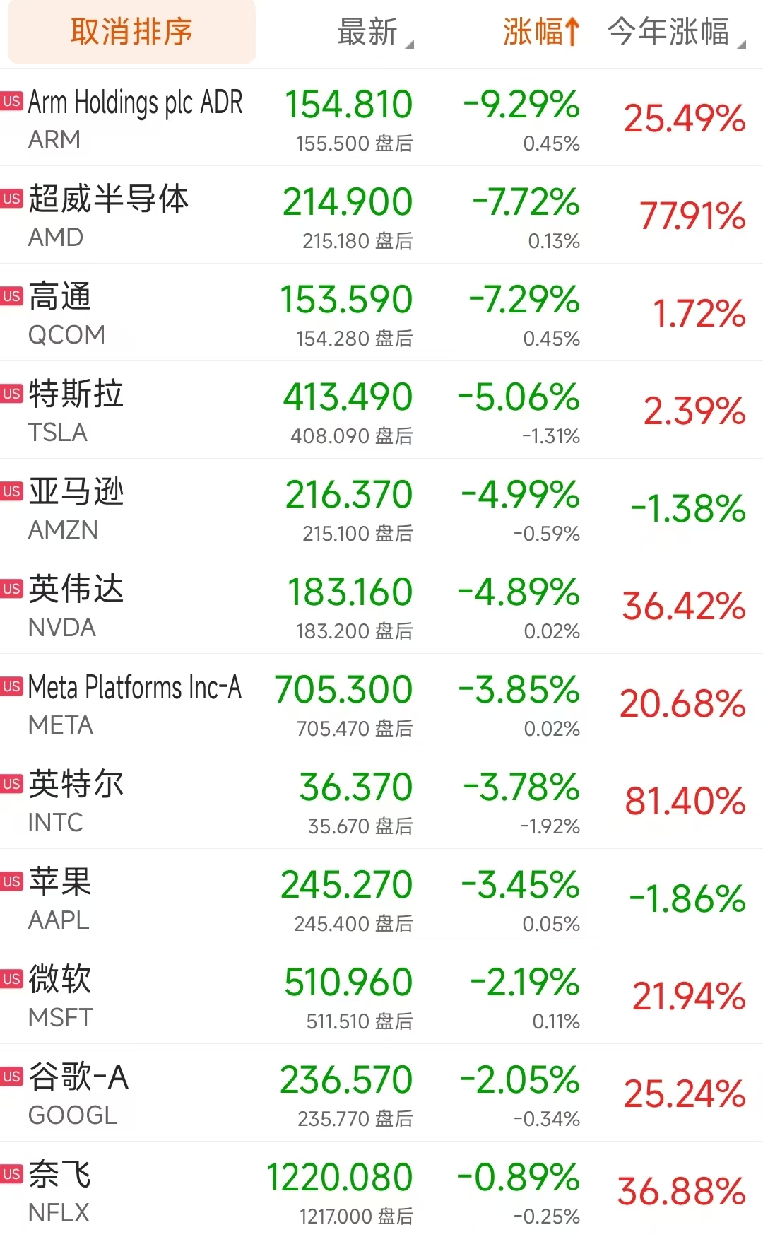 周五美股三大指数集体大跌,其中道琼斯跌878.82点,跌幅1.9%;纳斯达克跌820.2点,跌幅3.56%;标普500跌182.6点,跌幅2.71%。本周,道琼斯下跌2.73%,纳斯达克下跌2.53%,标普500跌2.43%。美股市场(关键词1)遭遇“黑色星期五”,大型科技股普跌,ARM跌超9%,超威半导体、高通跌超7%,特斯拉跌超5%,亚马逊、英伟达跌超4%。Meta、英特尔、苹果、微软、谷歌也明显下跌。