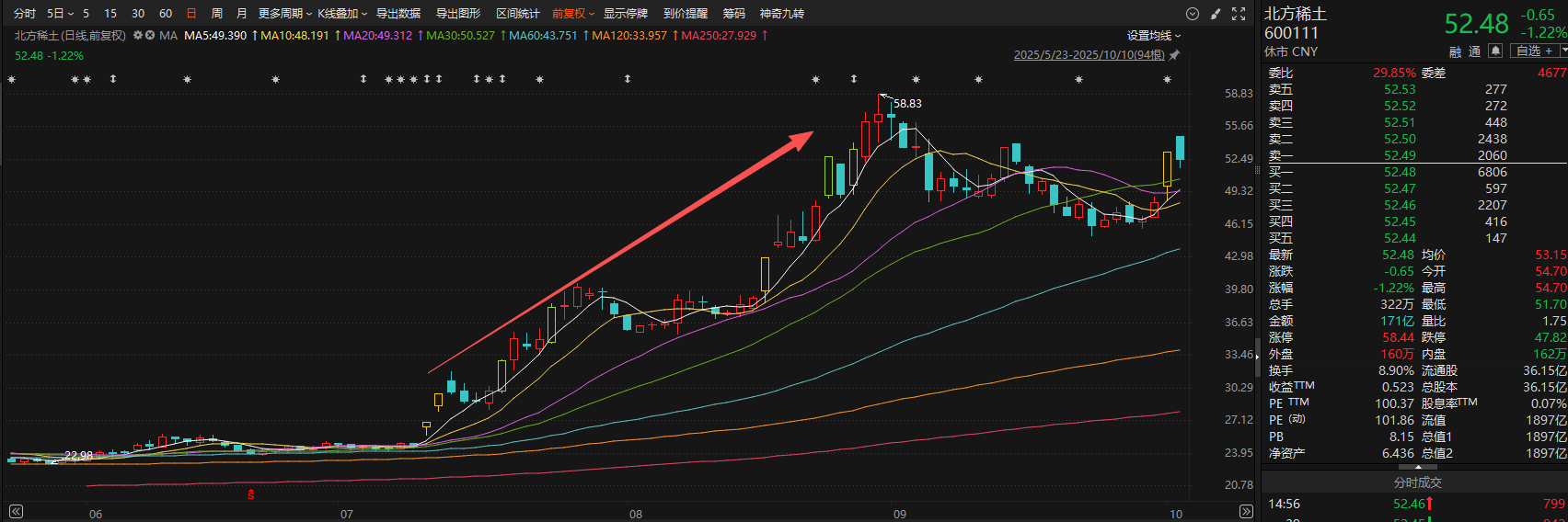 轻稀土龙头北方稀土预计归母净利润为15.1亿元-15.7亿元,同比增加272.54%-287.34%。报告期内,公司紧抓市场变化,强化预算管理与降本增效,科学组织生产,加强市场研判和营销运作,推进重点项目建设和科研创新,主要产品产销量同比增长,推动经营业绩大幅上升。北方稀土同时公告称,根据稀土精矿定价方法及2025年第三季度稀土氧化物价格,经测算并经公司总经理办公会审议通过,2025年第四季度稀土精矿交易价格调整为不含税26205元/吨(干量,REO=50%),REO每增减1%、不含税价格增减524.10元/吨。此前,北方稀土7月10日公告,第三季度稀土精矿交易价格调整为不含税19109元/吨。以此估算,此次价格环比上涨37.13%。二级市场方面,北方稀土自7月低点迄今股价累计最大涨幅达142.1%,公司最新收盘价52.48元/股,总市值1897亿元,稀土板块的价值重估持续进行。