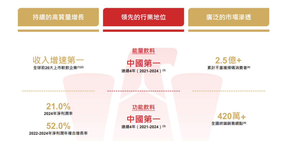 凭借高性价比优势以及更懂消费者的包装,东鹏饮料旗下的东鹏特饮抓住中国能量饮料市场快速扩容的红利,并在红牛争议悬而未决的有利外部环境下,近年来持续“狂飙”。根据弗若斯特沙利文报告,按销量计,东鹏饮料在中国功能饮料市场自2021年起连续4年排名第一,市场份额从2021年的15.0%增长到2024年的26.3%。按零售额计,东鹏饮料是2024年第二大功能饮料公司,市场份额为23.0%。